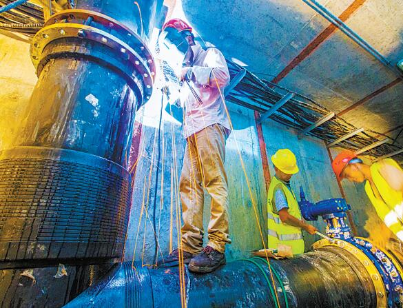 “这次管道割接和以往不同,是在东部新城地下的共同沟里。”现场负责人薛逸骅说,这次施工的管道跨度3公里,新铺设的管道在共同沟内,总长约400米,分3个割接点,预计总用时34小时,包括前期排水、割接作业和后续排污试压时间。由于共同沟空间狭小,大型机械无法使用,且地面管道与共同沟存在高度落差,这些给施工带来了困难。“施工需要的钢板、管道、阀门等搬运依靠人工。”他说。